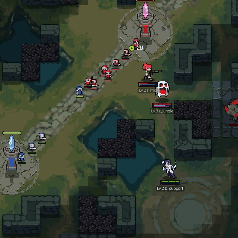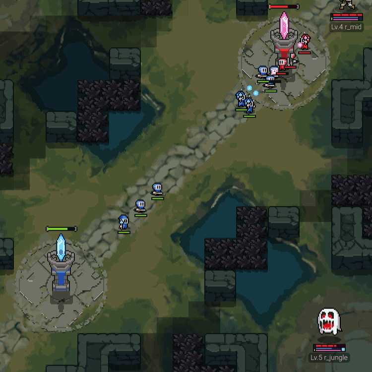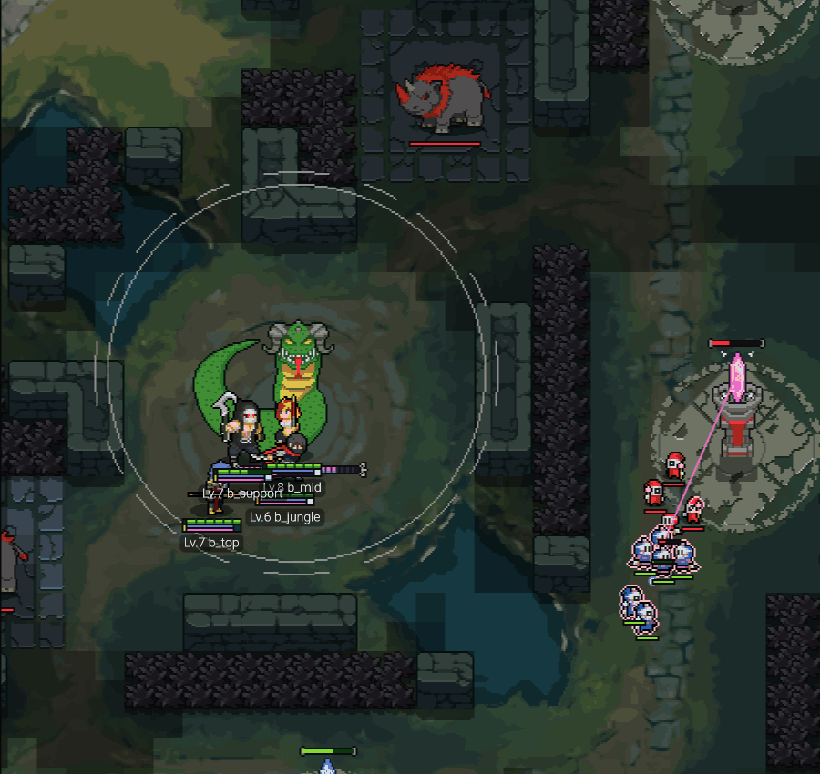 운영적인 측면에서도, 기존에는 위와 같이 중후반에 오브젝트 몹을 처치한 이후 상황에서 각 선수들이 누군가는 미드로, 누군가는 바텀으로 진행하고 싶어하고 근처 아군들이 모두 귀환한 상황에서도 혼자 라인을 밀다가 잘리는 등의 상황이 빈번하게 일어났습니다. 이런 상황들이 모두 큰 틀에서 각자의 의도를 공유하지 않고 각자의 생각대로 진행하기 때문인데, 이제 각자의 소통 과정을 통해 팀의 큰 목표를 공유하고 다같이 한 플레이를 진행하거나, 혹은 콜이 서로 갈려서 플레이가 꼬이는 등의 모습을 볼 수 있게 하고자 합니다.